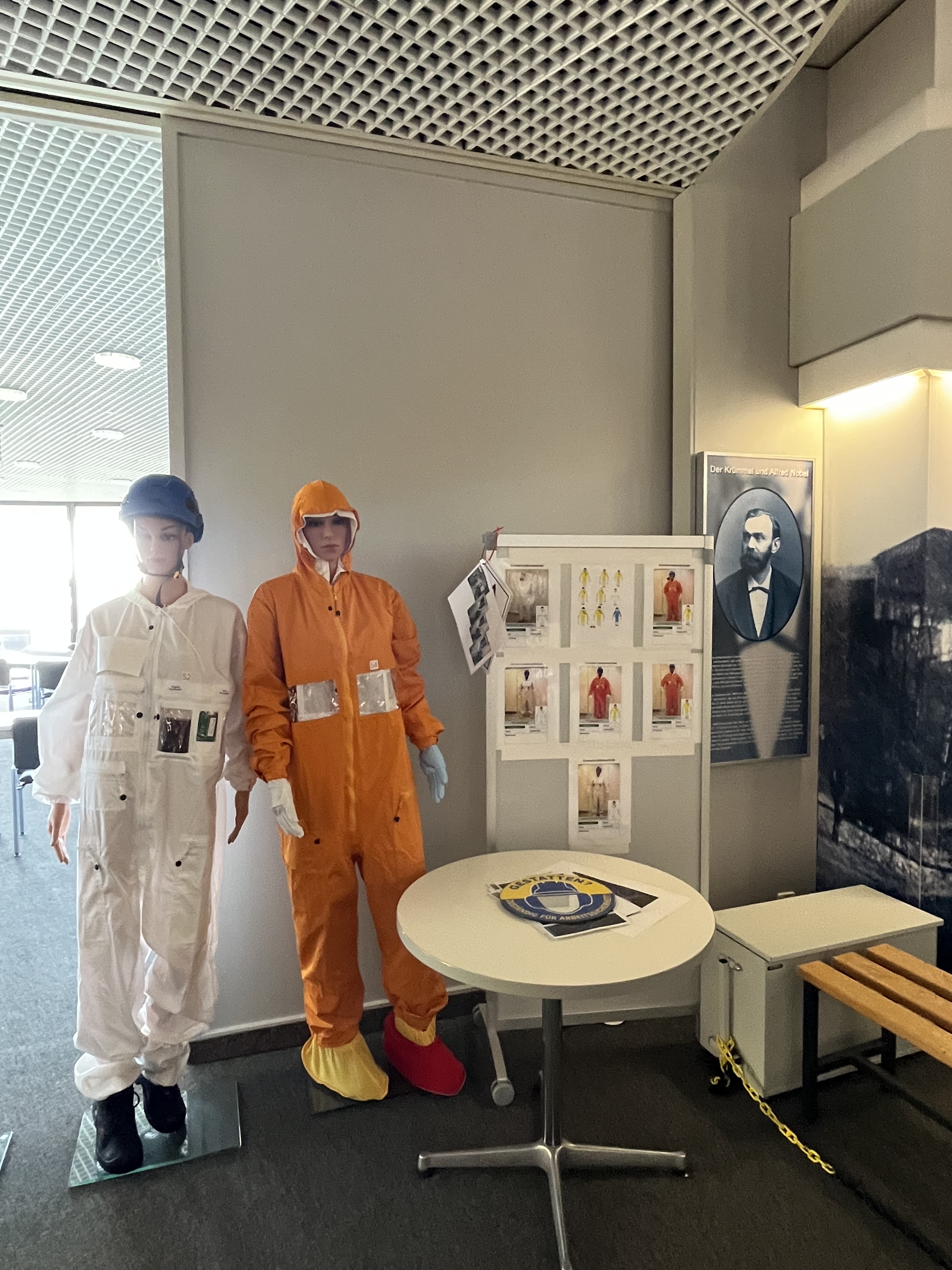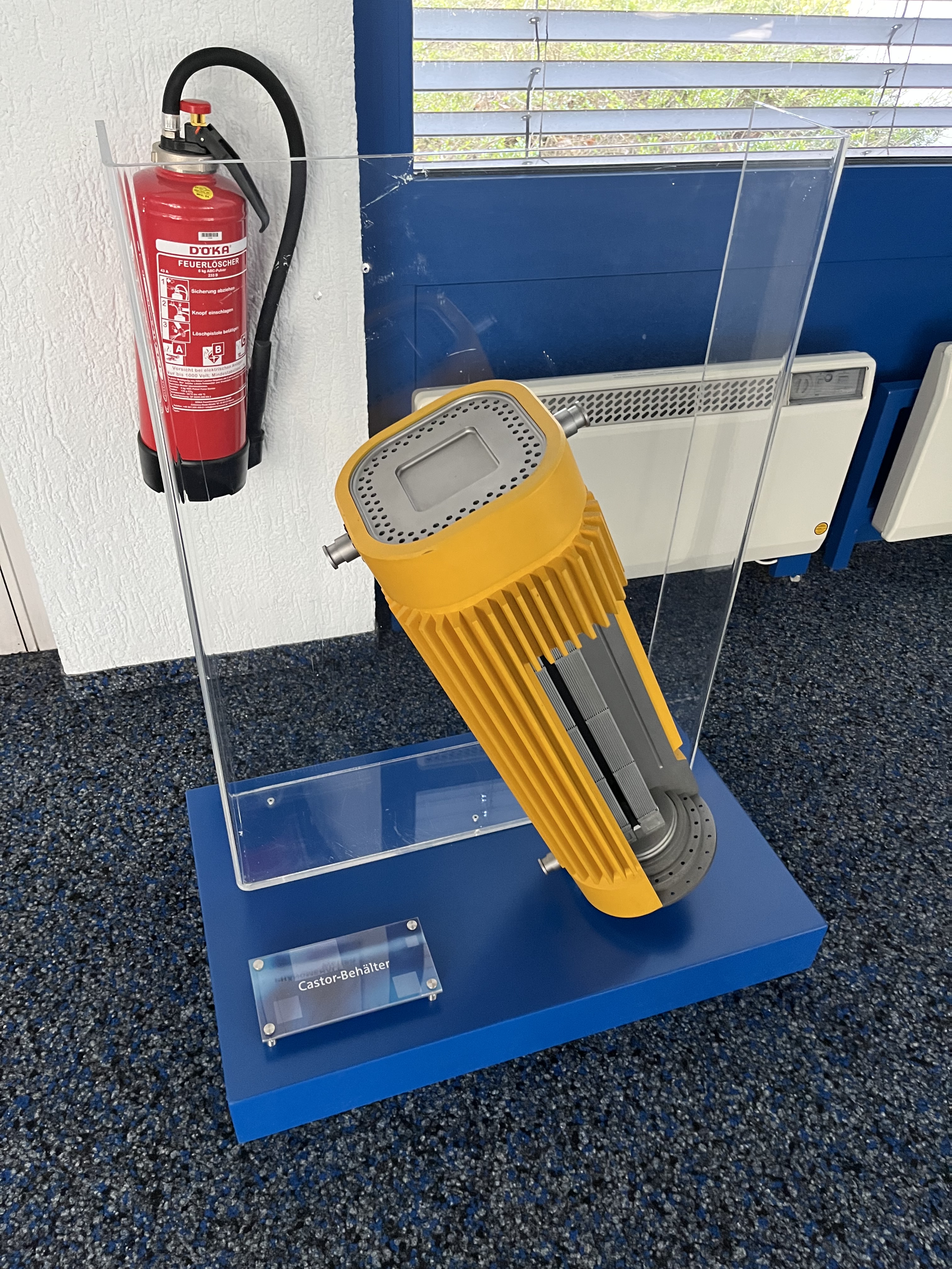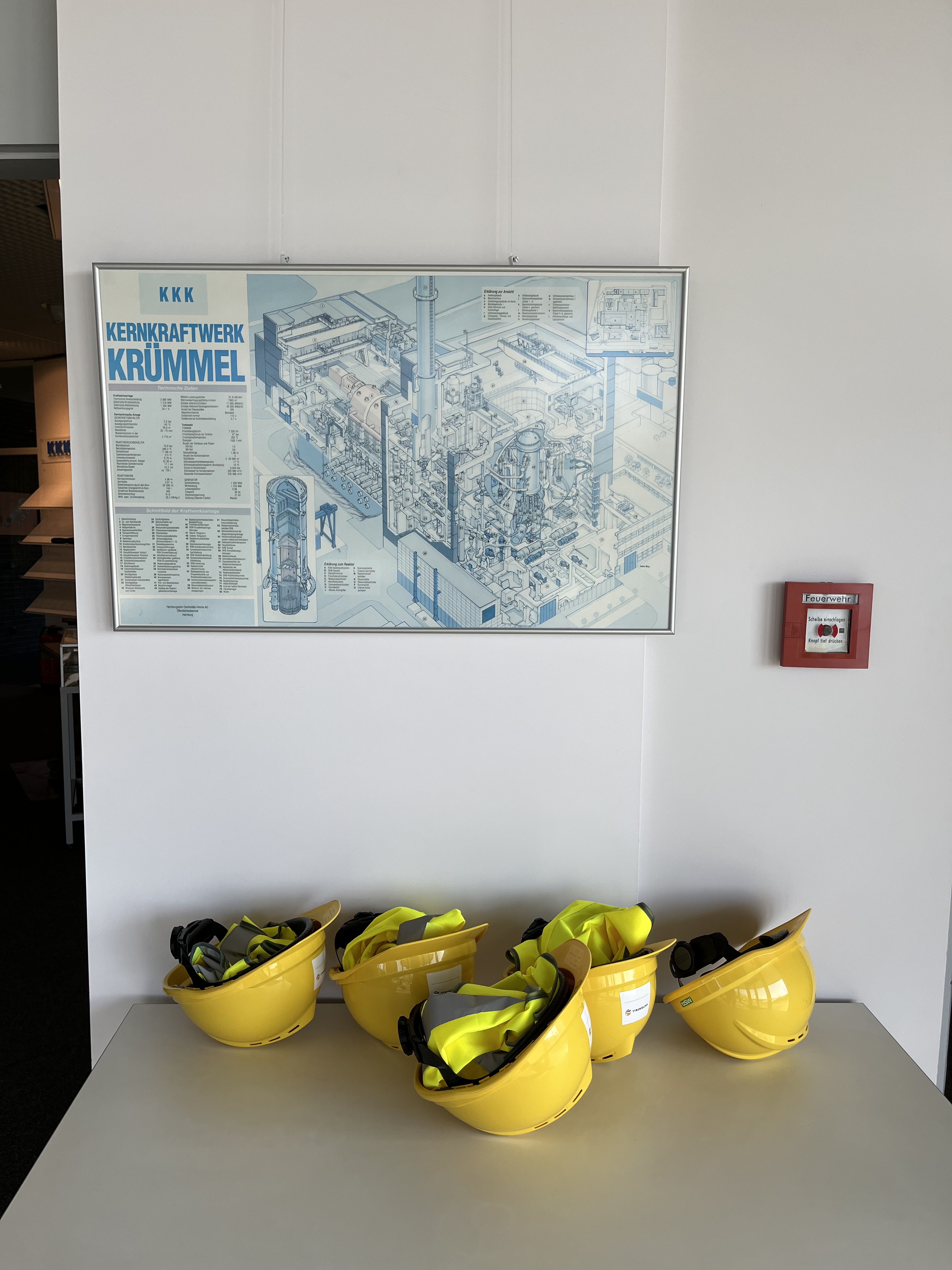 My first stop was the Krümmel nuclear power plant south-east of Hamburg, a boiling-water reactor operational from 1984 to 2011. The plant, a collection of scattered grey buildings, sits squeezed between the river Elbe and a small hill. It is also the site where Alfred Nobel built his first plant outside of Sweden and, in 1887, invented dynamite. The visitor center of Krümmel is a round pavilion outside of the restricted area on a small hill. It provides a beautiful view of the river – and of the anti-nuclear demonstrations which used to happen down there, as my guide tells me. The building is now mostly used for internal training purposes, but a piano and a fireplace still speak of a time when regular soirées, dialogues and information events were held here. The exhibition, though no longer updated, has all the typical features of a NPP visitor center: Dummies in safety gear, a model of the plant with buttons to activate lights, information about radiation and nuclear safety, as well as about nuclear waste storage and nuclear politics in Germany.