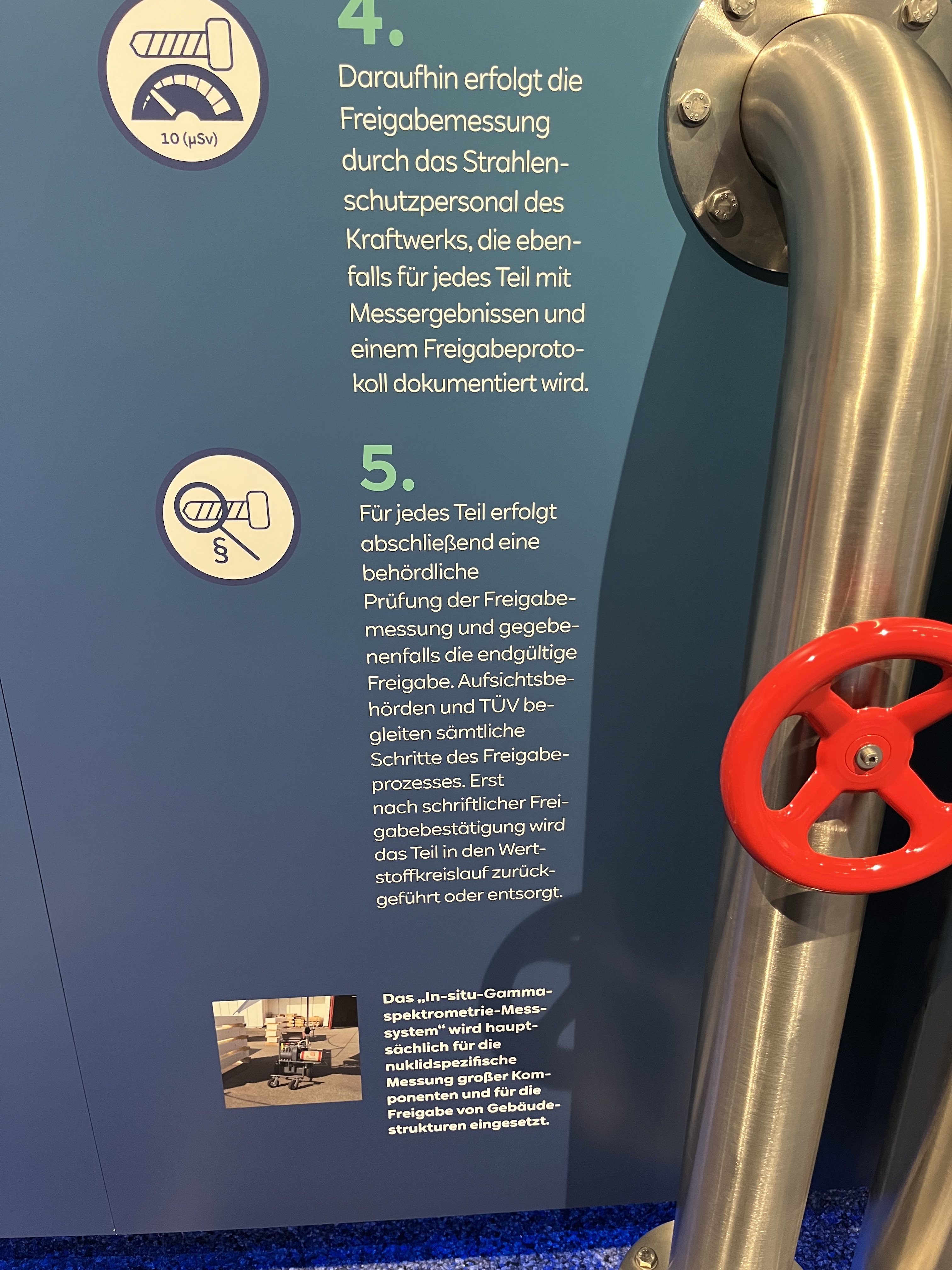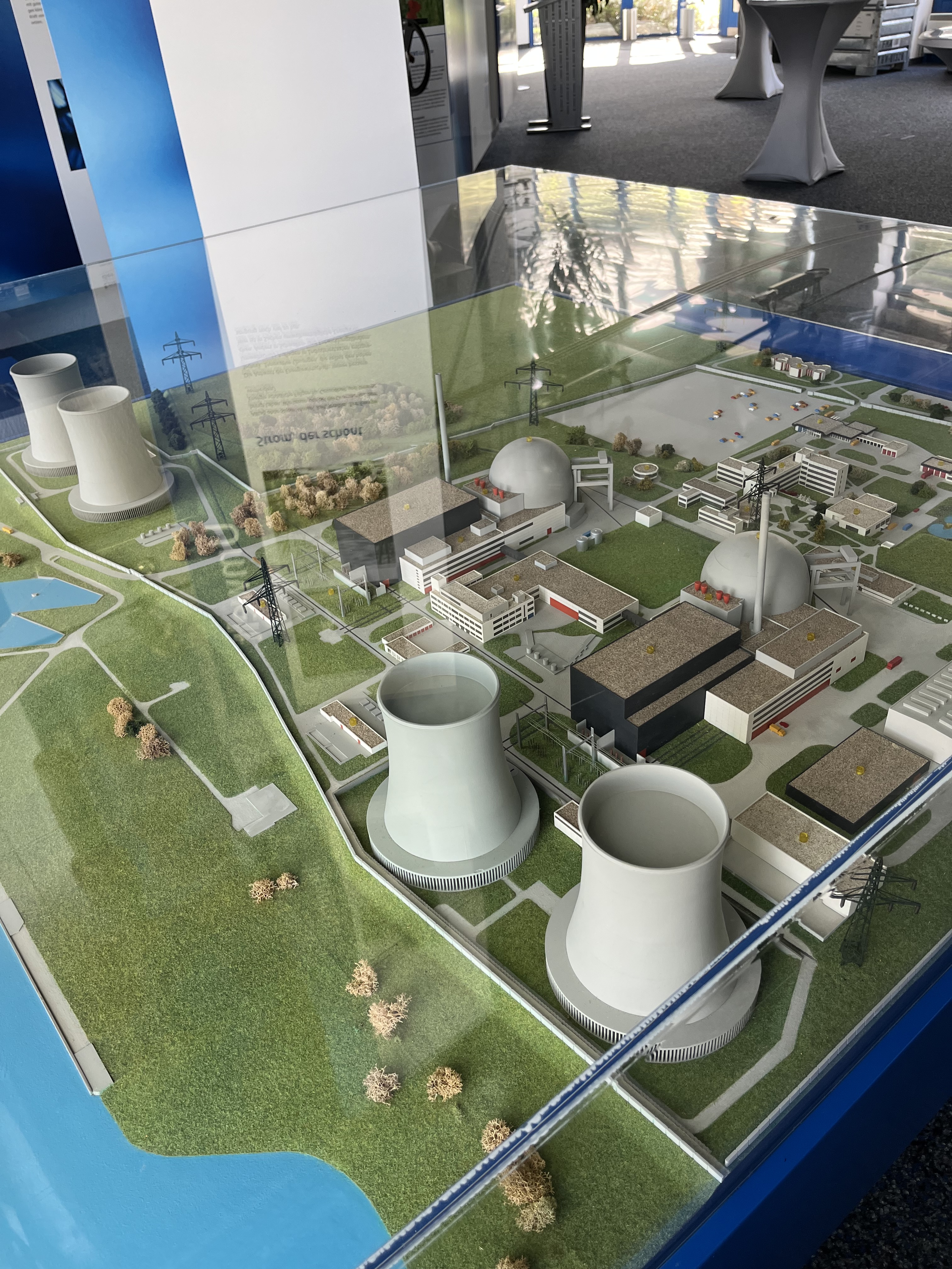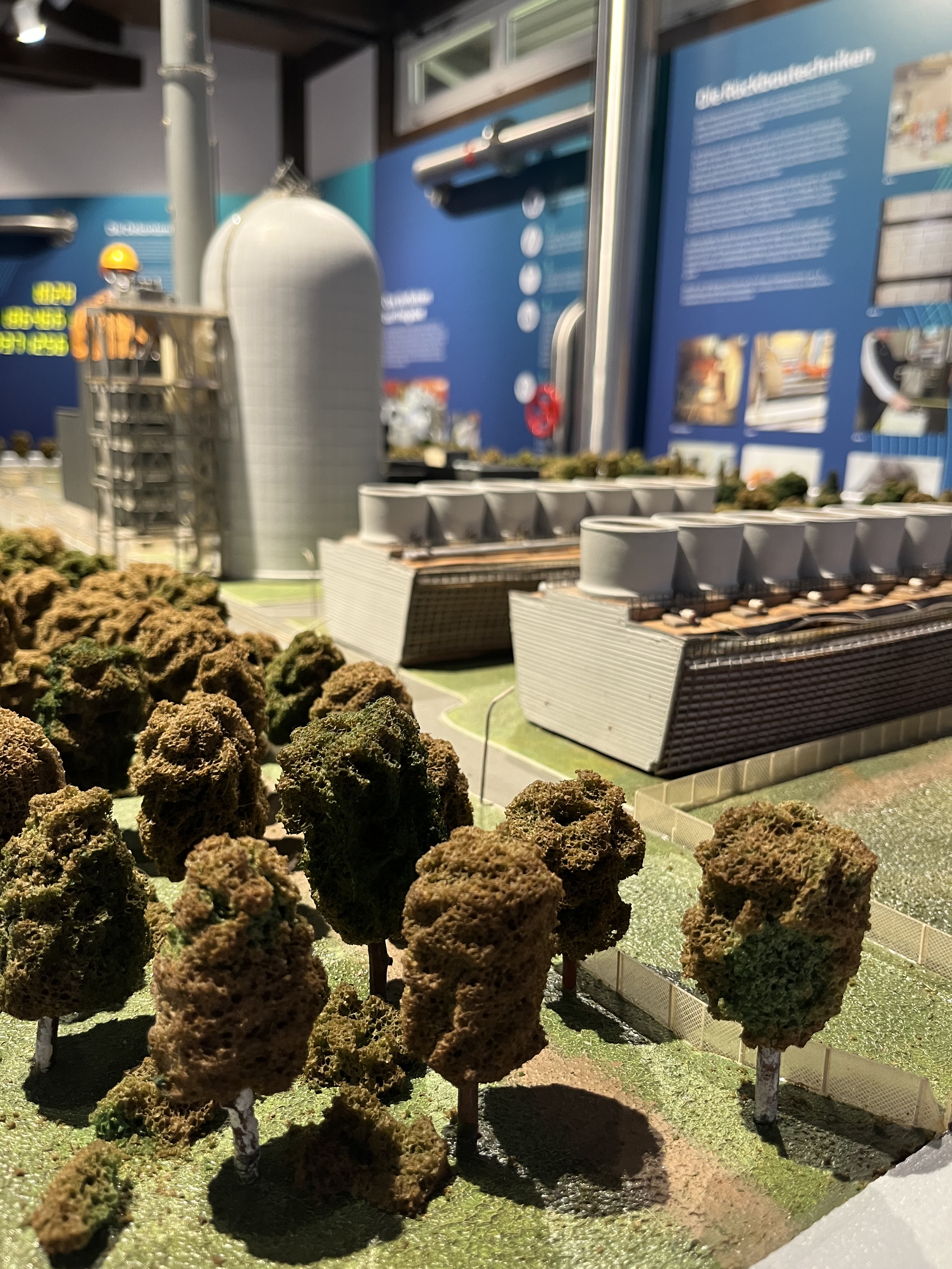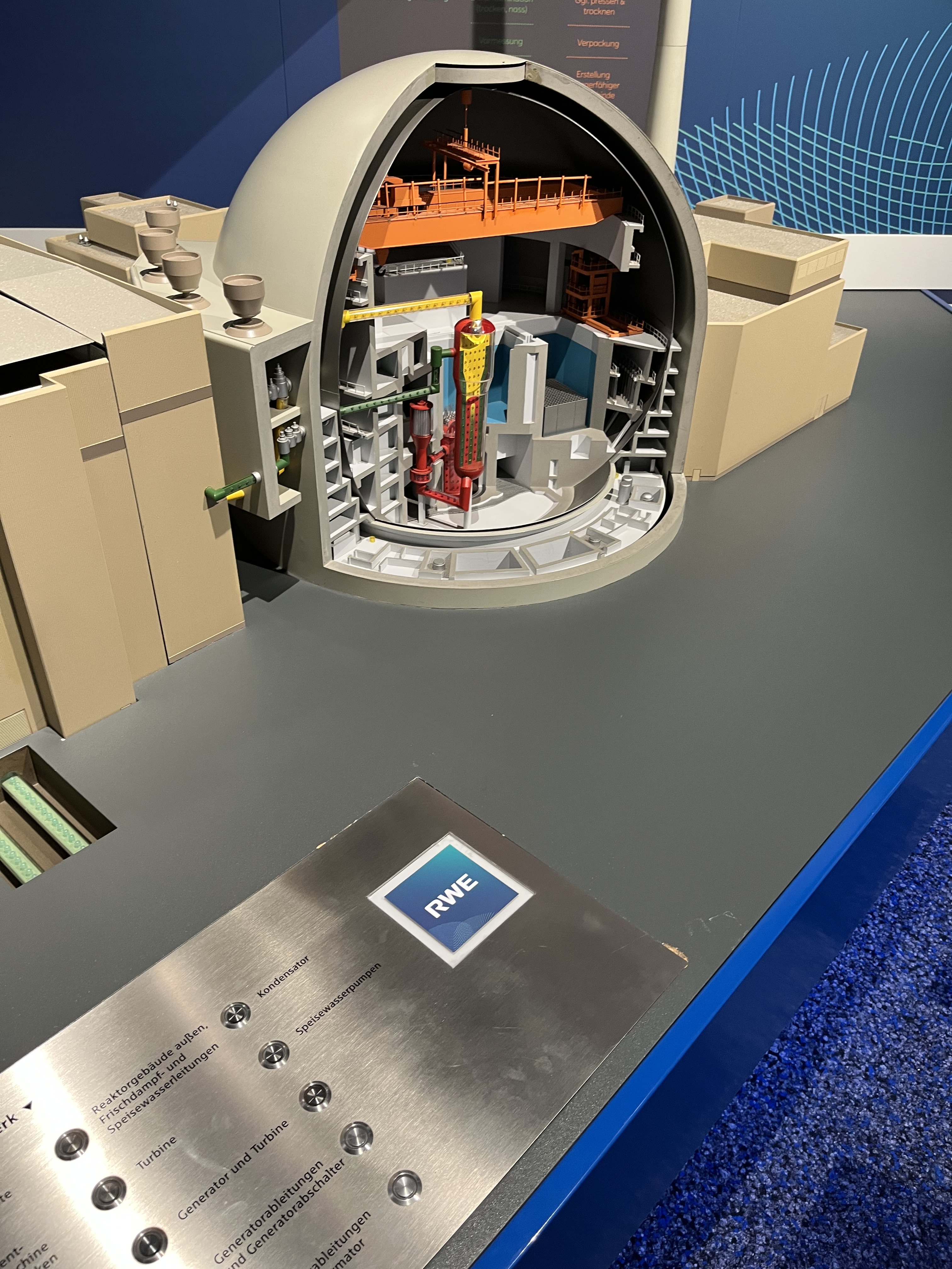 After a short stint in Brussels for a workshop, the next visitor center I saw belonged to a then still operational power plant, Emsland, close to the town of Lingen in north-west Germany. The exhibition had been recently modernized and will continue to be updated as the plant has now been shut down on 15th April 2023 as one of the final three plants in Germany. It presents a more streamlined version of what I have seen in Krümmel, stressing a narrative of complimentary energy sources, transition to renewables and into decommissioning of nuclear plants.